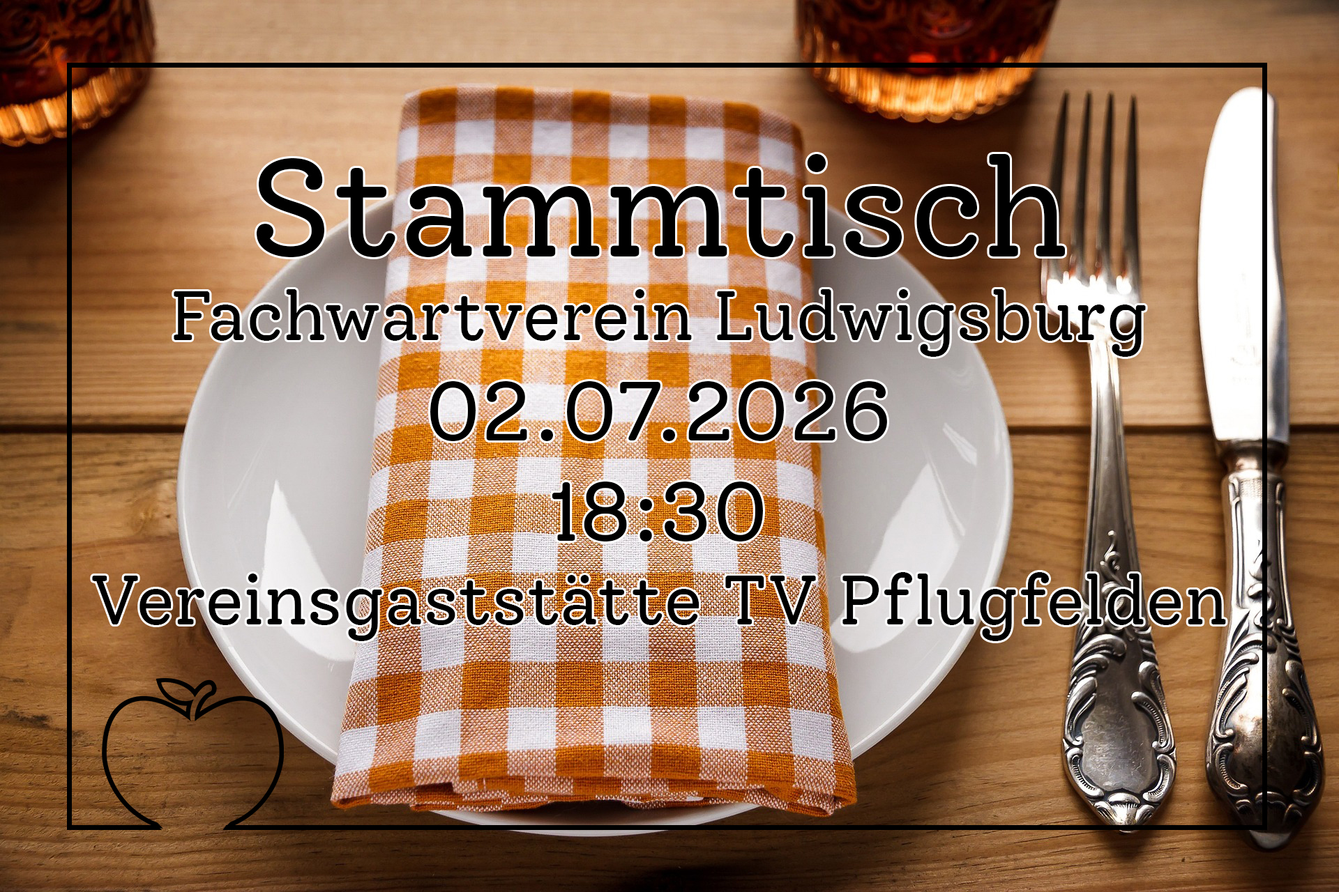 Vereinsgaststätte TV Pflugfelden Kleines Feldle 25, Ludwigsburg, DeutschlandVeranstaltungsart: offen, Stammtisch Zielgruppe: Vereinsmitglieder und Interessierte Veranstalter: Fachwartverein Referentin: Corinna Mailänder Ansprechpartner: Corinna Mailänder Am 02.07.2026 ab 18:30Uhr findet unser 11. Stammtisch des Fachwartvereins statt. Thema: Wird noch bekannt gegeben Der Vortrag dauert ca. 30 Minuten damit genug Zeit für den persönlichen Austausch bleibt. Eine Anmeldung bis zum 28.06.2026 notwendig: Es